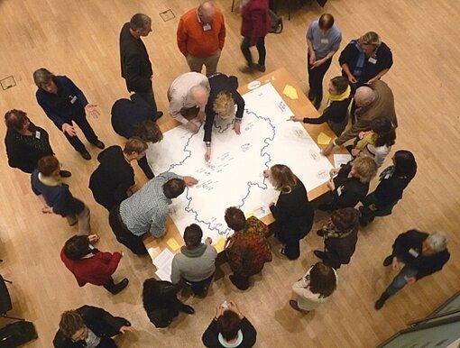 Nach einer kurzen Pause wurde für die Teilnehmenden die praktische Arbeitsphase eingeleitet: Zur Methoden-Erprobung wurde das Planning for Real vorgestellt und im Anschluss in Ansätzen erprobt. Ein breites Angebots-, Bedarfs-, Ressourcen- und Ideenspektrum für ganz Nordrhein-Westfalen war das Ergebnis der engagierten Teilnehmenden. Bei einem Spaziergang durch das umliegende Quartier konnten danach die Impulse und die Arbeitsphase reflektiert werden.