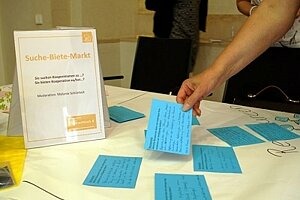 Am vierten Thementisch gab es nach Vorbild der Planning for Real Methode einen „Suche-Biete-Markt“. Hier konnten die Teilnehmenden ihre Bedarfe, Ressourcen, Angebote aber auch Ideen sammeln.