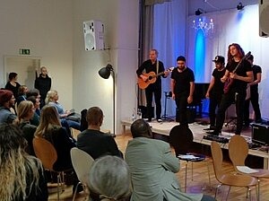 Danach folgte ein Auftritt der Zollhausboys. Die Zollhausboys sind eine Gruppe von vier jungen syrischen Musikern, die gemeinsam mit Pago Balke und Gerhard Stengert ein musikalisches Programm erarbeitet haben. Die Themen sind Flucht, Heimat und Fremdheit und beruhen teilweise auf eigenen Erlebnissen der Musiker. Im Anschluss an die musikalische Darbietung erzählten die vier jungen Syrer etwas aus ihrem Leben in Deutschland und gaben den Teilnehmenden einen dezenten Einblick in ihr Gefühlsleben.