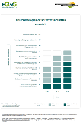 Mehr zum Fortschrittsdiagramm ist nachzulesen im Praxisheft „Praxis Präventionskette Nr. 7", Download unter www.praeventionskette-nds.de