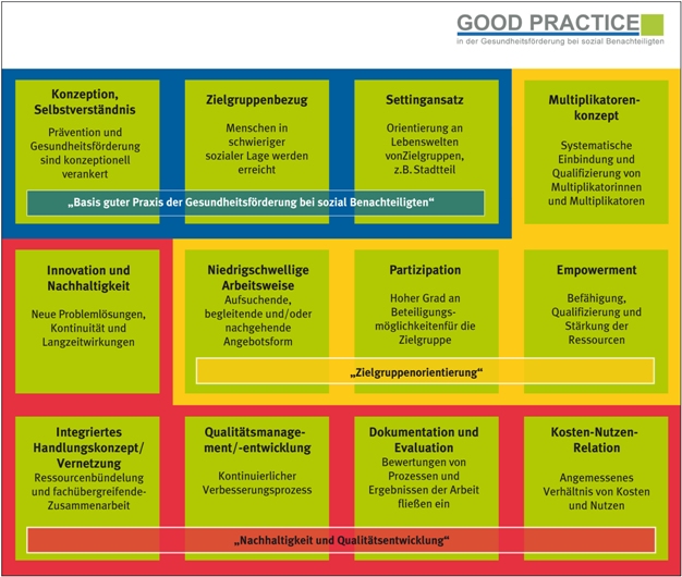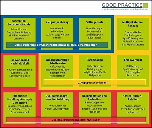 Ein Bestandteil dieser nachhaltigen Strukturen können Angebote der Gesundheitsförderung sein, die langfristig, finanziell und personell gut abgesichert durchgeführt werden. Dieses Verständnis von Nachhaltigkeit als „dauerhafte Sicherung des Angebotes“ ist für die Anbieter von Gesundheitsförderung besonders wichtig, um ihre Arbeit auf einer verlässlichen Basis fortführen zu können. Doch langfristig gesicherte Arbeit alleine ist nicht genug. Gesundheitsförderliche Interventionen müssen immer wieder an die sich ändernden Bedingungen angepasst werden. Deshalb hat der beratende Arbeitskreis für das entsprechende Good Practice-Kriterium das Begriffspaar „Innovation und Nachhaltigkeit“ gesetzt.