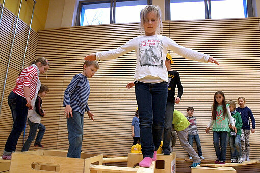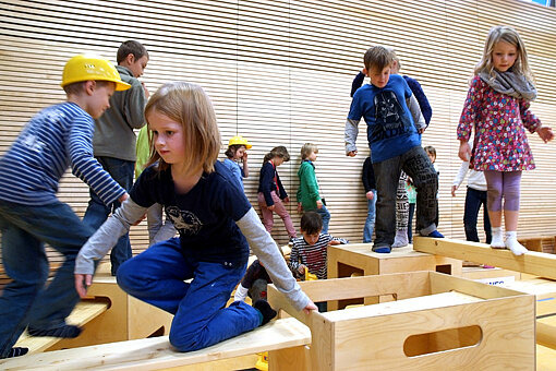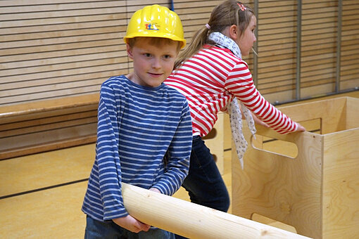 Eine Bewegungsbaustelle besteht aus einfachen Holzbauteilen, die wie überdimensionale Bauklötze zusammensetzbar sind. Sie ist für Kinder zwischen zwei und zwölf Jahren geeignet. Die Kinder entwickeln, konstruieren und erproben damit Spiel- und Bewegungsräume, die immer wieder umgebaut werden können. Die einzelnen Bauteile kann man alleine nur schwer bewegen. Viel mehr Spaß macht es, mit anderen zu bauen. Es entstehen dabei Bewegungslandschaften, die vielseitig beklettert und bespielt werden können. Die Bewegungsbaustelle fördert nicht nur die Motorik, sondern gleichzeitig die Kreativität und die geistige, soziale und kognitive Entwicklung. Denn wer rückwärts balancieren kann, kann auch rückwärts rechnen. Somit bietet die Bewegungsbaustelle mehr als reine Bewegungsförderung und lässt sich nicht nur im Unterrichtsfach Sport in den Schulalltag integrieren. Kinder erlangen mithilfe der Bewegungsbaustelle technisches Verständnis, sprachliche Kompetenzen oder können mit ihr sogar musizieren.