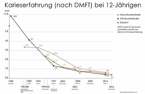 So ist in Deutschland die Zahnkaries bei Kindern (12-Jährige) in den letzten 30 Jahren durch sehr erfolgreiche Präventionsstrategien durchschnittlich um 88 Prozent zurückgegangen. In Deutschland wiesen 12-Jährige im Jahr 2016 lediglich 0,4 löchrige, reparierte oder fehlende Zähne auf, 1989 waren es noch 4,1 betroffene Zähne (s. Abb. 1).