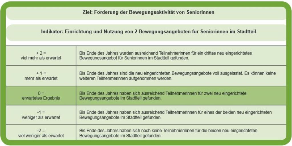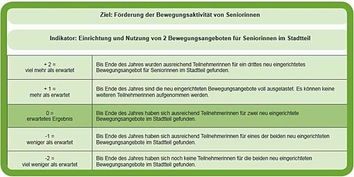 Die Zielerreichungsskala umfasst Werte von +2 (viel mehr als erwartet) bis -2 (viel weniger als erwartet). Ihre einzelnen Stufen werden für jedes Projektziel eigens am Runden Tisch ausformuliert.