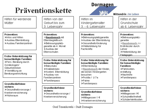 In Modellprojekten sind inzwischen Formen eines übergreifenden Handelns im Sinne des Setting-Ansatzes verwirklicht, besonders bekannt dabei ist das sog. „Dormagener Modell“ (Sandvoss & Kramer 2010). Hier wurden in der rheinischen Kleinstadt Frauen- und Kinderärztinnen und -ärzte, Hebammen, Mitarbeitende von Gesundheits- und Jugendämtern, Kitas und Schulen zu einem gemeinsamen systematischen Vorgehen motiviert, strukturell eingebunden und abgesichert durch eine sog. "Präventionskette" (siehe Abbildung). Ähnliche Aktivitäten werden auch aus anderen Kommunen berichtet, so "MoKi" aus Monheim (Berg 2010), "Adebar" aus Hamburg (Hartmann 2010) oder "Schutzengel" aus Flensburg (Syring 2006).