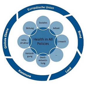 Der Health in All Policies-Ansatz setzt ein komplexes Zusammenwirken verschiedener Ebenen voraus: