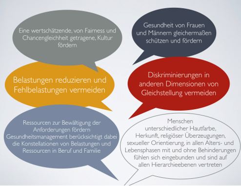 Bei der Implementierung eines Projektes für gesundheitliche Chancengleichheit sollten im ersten Schritt Gleichstellungsziele formuliert werden. Beispiele für mögliche Formulierungen sind in Abb. 1 aufgeführt. Hierbei können die Ziele nicht losgelöst von der Organisation und ihrer Unternehmenskultur betrachtet werden. Als hilfreich hat sich erwiesen an bestehende Wertorientierungen anzuknüpfen und herauszuarbeiten, wo ggf. betriebliche Praktiken, Strukturen und Ausdrucksformen in Konflikt zu den Gleichstellungszielen geraten.