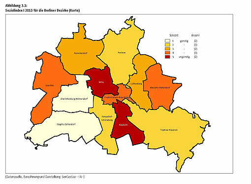 Die Bezirke Friedrichshain-Kreuzberg, Marzahn-Hellersdorf, Spandau, Mitte und Neukölln (Rangplätze 8 bis 12) sind durch vergleichsweise ungünstige Befunde gekennzeichnet. Bei hohen Zuzugsüberschüssen überwiegen einfache Wohnlagen, Arbeitslosigkeit, Transferleistungsbezug, überdurchschnittliche Armutsrisikoquoten und niedrige Einkommen. Spandau, Mitte und Neukölln verzeichnen die höchsten Wanderungssaldi in Berlin. Der Sozialstatus von Familien mit Einschülern und Einschülerinnen wird als vergleichsweise niedrig eingeschätzt, am schlechtesten in Neukölln. Die mittlere Lebenserwartung liegt unter dem Berliner Durchschnitt. Die vorzeitige Sterblichkeit und Neuerkrankungsrate insbesondere an bösartigen Neubildungen sowie die vermeidbare Sterblichkeit an ischämischen Herzkrankheiten, an bösartigen Neubildungen der Bronchien und der Lunge wie auch die Neuerkrankungsrate an tabakassoziierten bösartigen Neubildungen und an offener Lungentuberkulose sind vergleichsweise hoch ausgeprägt. Größere Teile der Bevölkerung als im Berliner Durchschnitt rauchen. Auf Marzahn-Hellersdorf treffen diese Befunde zur gesundheitlichen Lage weniger stark zu. Die letzten drei Rangplätze unter den Planungsräumen nehmen Wassertorplatz (FK), Hellersdorfer Promenade (MH) und Moritzplatz (FK) ein.