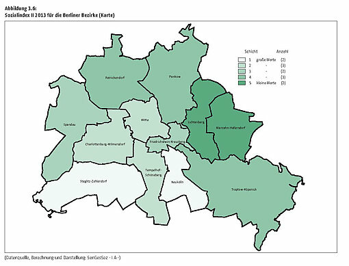 Die Analyse wurde auf räumlicher Ebene der Berliner Bezirke anhand von 66 Indikatoren aus den Bereichen Bevölkerungs- und Haushaltsstruktur, Bildung, Erwerbsleben, Einkommen und materielle Lage sowie Gesundheit vorgenommen. Darunter standen 36 Indikatoren auch für die Analyse auf Planungsraumebene zur Verfügung. Die Ergebnisse finden für wichtige planerische Fragestellungen der Politikfelder Gesundheit und Soziales des Berliner Senats Verwendung.