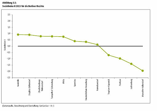 Steglitz-Zehlendorf, Charlottenburg-Wilmersdorf und Pankow sind die Bezirke mit der günstigsten Sozialstruktur in Berlin (Rangplätze 1 bis 3). Dies äußert sich in niedrigen Arbeitslosenquoten, niedrigen Transferleistungsquoten (Rechtskreis SGB II, Rechtskreis SGB XII), niedrigen Arbeitslosengeld I - Empfängerquoten und hohen mittleren Haushaltsnetto- und Pro-Kopf-Einkommen. Die mittlere Lebenserwartung ist im Berliner Vergleich hoch, die Rate vorzeitiger Sterblichkeit gering. Die Sozialstruktur der Familien mit Schulanfängern und Schulanfängerinnen ist günstig. Unter den Berliner Planungsräumen erreichen Thielalle (SZ), Messelpark (CW) und Dahlem (SZ) die günstigsten Werte.