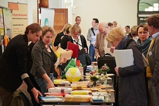 Auf dem „Markt der Möglichkeiten“ im ersten Stock der Staatskanzlei stellten mehr als 20 Akteure und Partner aus Brandenburg ihre Arbeit vor und bildeten den bunten Rahmen für das „Get together“ in der Mittagspause.