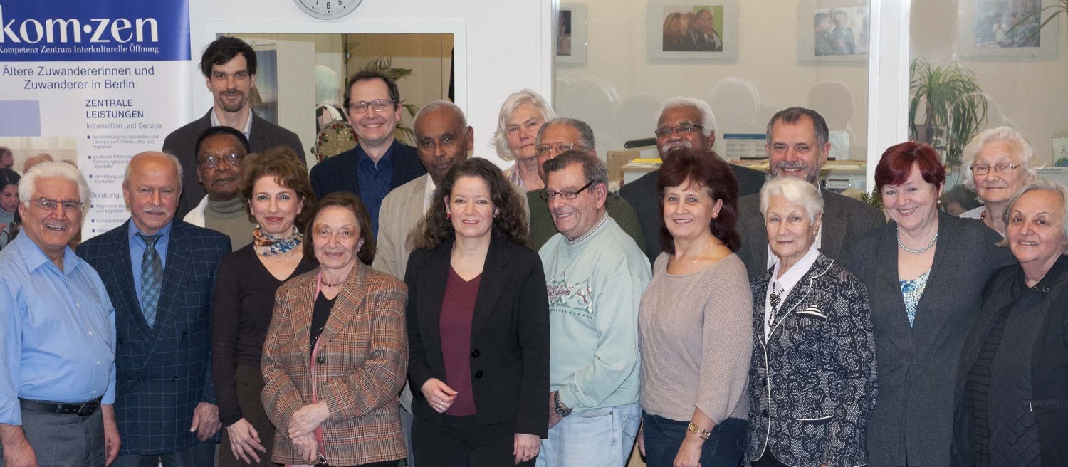 Ein zentrales Anliegen des kom•zen ist es, älteren Menschen mit Migrationserfahrung im kommunalen Rahmen Anregungen und Unterstützung zum Mitgestalten zu geben. Möglichkeiten dazu bestehen unter anderem bei den bezirklichen Seniorenvertretungen, der Landesseniorenvertretung (LSV) sowie dem Landesseniorenbeirat (LSBB). Der Landesseniorenbeirat berät das Abgeordnetenhaus und den Senat von Berlin in seniorenpolitisch relevanten Themen. Dazu unterhält er themenspezifische Arbeitsgruppen, die sich aus gewählten und delegierten Seniorenvertretern aller Berliner Bezirke zusammensetzen. Das kom•zen beteiligt sich an der Arbeitsgruppe Migration des LSBB, in der vor allem Maßnahmen zum Umsetzung der seniorenpolitischen Leitlinie 13 „Ältere Migrantinnen und Migranten“ diskutiert, entwickelt und beobachtet werden. Zu den Zielen der seniorenpolitischen Leitlinien gehört es auch, politisches Engagement, soziale und kulturelle Teilhabe sowie Selbstbestimmung Älterer mit Migrationserfahrung zu fördern. Das kom•zen motiviert ältere Menschen mit Migrationserfahrung für die bezirklichen Seniorenvertretungen zu kandidieren und ist eine wichtige Anlaufstelle für Austausch und Informationsvermittlung geworden.
