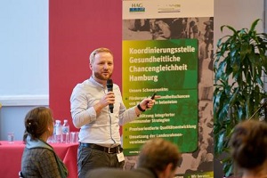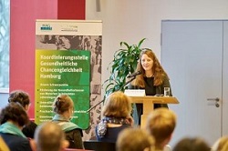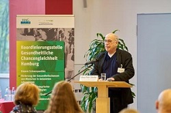 Nach den einführenden Worten der HAG-Vorsitzenden Prof. Dr. Corinna Petersen-Ewert stellte Klaus-Peter Stender (Behörde für Gesundheit und Verbraucherschutz, BGV) die aktuellen Entwicklungen der Umsetzung des Präventionsgesetzes dar. Kooperation werde dabei vertikal vom Bund bis in die Kommune dekliniert. In Hamburg sei es gelungen, sich auf ein gemeinsames und abgestimmtes Vorgehen aller Sozialversicherungsträger und der BGV zu verständigen. Neu sei mit der Ausrichtung der LRV auf die Sozialräume, dass die Gesundheitsförderung vor Ort sowie die Beteiligungsmöglichkeiten von Bürger_innen und Multiplikator_innen stärker auf- und ausgebaut werden können. Stender verortete Kooperation als Kern und zugleich Mysterium der Gesundheitsförderung.