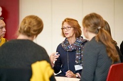 Als Start in die erste Praxisphase wurde in „Murmelgruppen“ die Frage „Was ist für mich in der kommunalen Zusammenarbeit mit anderen Akteuren wichtig?“ beantwortet. Die Teilnehmenden tauschten sich anschließend über ihr jeweiliges berufliches Selbstverständnis, ihre Handlungsempfehlungen und gesetzlichen, beruflichen und institutionellen Grundlagen aus. Gemeinsam wurde reflektiert, welche Denk- und Handlungslogik sie damit täglich für eine multiprofessionelle Zusammenarbeit in Einklang bringen. Die Vielfalt wurde an Metaplanwänden dokumentiert und gruppiert.