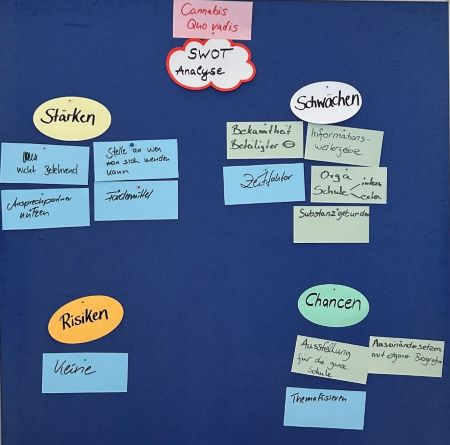 Im Anschluss daran wurden mittels einer SWOT-Analyse drei Projekte der Cannabisprävention auf den Prüfstand gestellt.