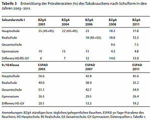 Auch hier lassen sich markante, dem allgemeinen Trend entsprechende Rückgange erkennen, allerdings mit deutlichen Unterschieden zwischen den Schulformen. Nach den BZgA-Daten hat sich der Prävalenzabstand zwischen den Haupt-/Realschulen und den Gymnasien beim regelmäßigen Rauchen von 6 Prozentpunkten im Jahr 2001 auf 13 Prozentpunkte in 2011 erhöht und damit mehr als verdoppelt. Und die ESPAD-Daten zeigen, dass die Raucherquote in den Gymnasien und den Real- und Gesamtschulen über die gesamte Beobachtungszeit kontinuierlich zurückging, hingegen in den Hauptschulen ab 2007 wieder zunahm und im Jahr 2011, so wie in 2001, um fast 20 Prozentpunkte über der Raucherquote der Gymnasien lag (Tabelle 3).