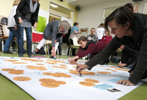 Die gemeinsame Erstellung einer Netzwerkkarte bildete den Einstieg und die Grundlage, sich ein Bild über die bereits bestehenden Netzwerke in Hohenhorst zu verschaffen. Die Akteurinnen und Akteure fanden sich hierzu in Zweiergruppen zusammen und befragten sich gegenseitig zu ihrer Person und Institution sowie ihren konkreten Aktivitäten und Projekten im Stadtteil Hohenhorst. Die anschließende Visualisierung auf einer Wandzeitung durch Verbindungslinien zwischen den einzelnen Personen und ihren Aktivitäten verdeutlichte zum einen eine große Vielfalt an bestehenden Kooperationen, zum anderen wurden thematische Schwerpunkte der Netzwerkarbeit in Hohenhorst sichtbar.