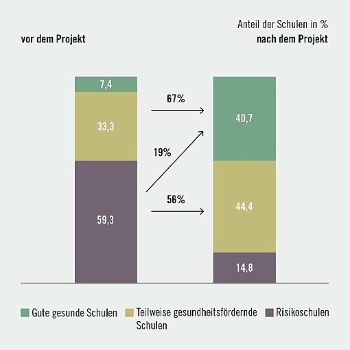 Gesundheitsgefährdende Arbeits-bedingungen wurden entscheidend reduziert: Der Anteil von Risikoschulen mit erheblichen Gesundheitsrisiken für Lehrkräfte, Schülerinnen und Schüler hat im Projektverlauf deutlich abgenommen (vgl. Abb. 1). Zu Projektbeginn wurde die Mehrheit der Schulen durch ihren hohen Anteil von ungünstigen Lern- und Arbeitsbedingungen als Risikoschule klassifiziert. Durch die Projektteilnahme konnten sich 75 Prozent der Risikoschulen zu teilweise gesundheitsfördernden Schulen oder sogar zu guten gesunden Schulen entwickeln. Insgesamt wiesen nach dem Projekt 85 Prozent der Schulen mindestens teilweise gesundheitsförderliche Arbeits- und Lernbedingungen auf. Der Anteil von guten gesunden Schulen konnte sich zum Projektabschluss verfünffachen. Keine einzige Projektschule hat sich verschlechtert.