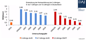 Die Studie ergab für die untersuchten 12-Jährigen einen DMFT-Wert von 0,44. 78,8 Prozent der Kinder in dieser Altersgruppe wiesen naturgesunde Gebisse auf. Beide Werte, die besten, die jemals in Deutschland erreicht wurde, verweisen auf hervorragende Präventionserfolge im bleibenden Gebiss der Kinder. Die 6- bis 7-jährigen Schulanfänger, in deren Mündern sich noch hauptsächlich Milchzähne befinden, beträgt der dmft-Wert dagegen 1,73. In dieser Altersgruppe wiesen lediglich 53,8 Prozent der Kinder naturgesunde Gebisse auf. Hier zeigt sich nur eine leichte Verbesserung im Bundesdurchschnitt gegenüber den im Jahr 2010 bei der letzten DAJ-Studie erhobenen Werten, für einige Bundesländer auch eine geringfügige Verschlechterung. Somit tragen die 6- bis 7-Jährigen im Vergleich zu den 12-Jährigen nach wie vor eine höhere Karieslast. Die erstmalige Erfassung der 3-Jährigen im Rahmen der Epidemiologischen Begleituntersuchungen ergab für diese Altersgruppe einen dmft-Wert von 0,48. Damit sind 13,7 Prozent der 3-Jährigen in Kitas bereits von Karies betroffen, 86,3 Prozent haben naturgesunde Gebisse. Diese für Deutschland repräsentativen Daten untermauern, was sich aufgrund bisheriger regionaler Stu-dien und klinischer Erfahrungen bereits andeutete: Ein Teil der Milchzahnkaries entsteht sehr früh. Eine verhältnismäßig kleine Gruppe von Kindern leidet unter starkem Kariesbefall (3,57 dmft), der nur sehr schwer und nicht selten in Narkose zu sanieren ist, während die meisten Altersgenossen gesunde Milchzähne haben. Dies zeigt, dass bereits zu einem sehr frühen Zeitpunkt eine soziale Polarisation der Karies zu verzeichnen ist.