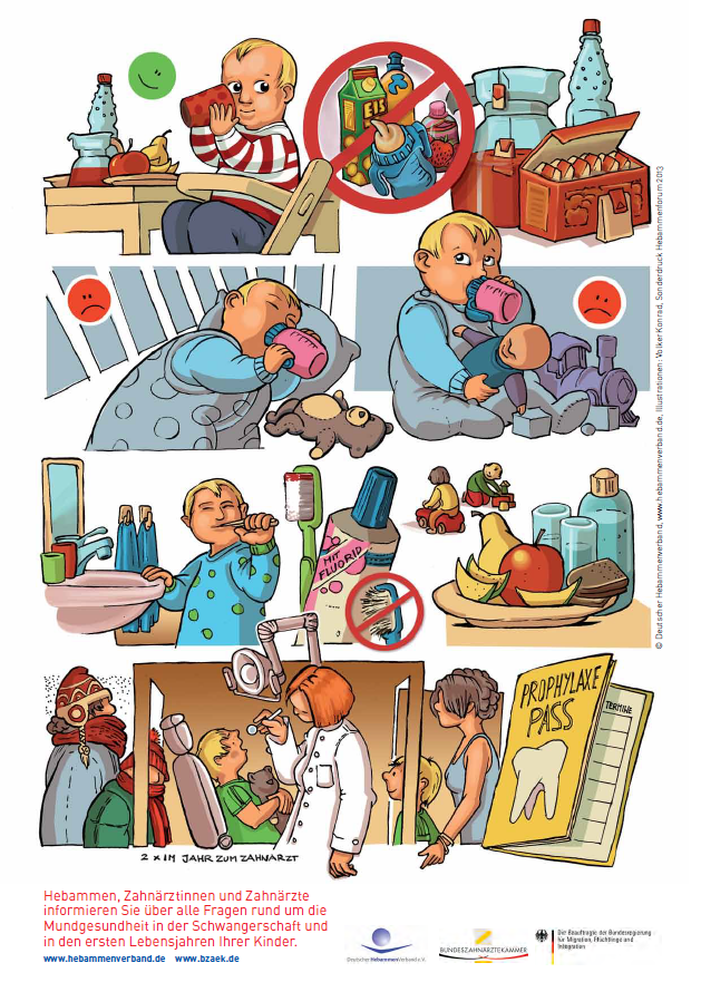 Frühkindliche Karies, oder auch Nuckelflaschenkaries, ist ein zunehmendes Problem. Zu viele Kleinkinder haben bereits stark zerstörte Zähne. Das betrifft alle Gesellschaftsschichten, tritt aber gehäuft in Familien mit einem niedrigen sozialen Status auf. Gerade Eltern in schwierigen sozialen Lebenslagen wissen zu wenig über die richtige mundgesunde Ernährung oder Mundpflege bei Säuglingen und Kleinkindern. Dauernuckeln von Säften, Schorlen und gesüßtem Tee ist für kleine Kinder ungeeignet. Das Resultat ist oftmals die tiefgreifende Zerstörung von Milchzähnen. Mit all ihren Folgen wie Schmerzen oder Zahnverlust, einem deutlich erhöhten Risiko für Karies des bleibenden Gebisses, Störungen der Sprachentwicklung und einer gesunden körperlichen sowie psychischen Entwicklung des Kindes. Frühkindliche Karies lässt sich erfolgreich verhindern, wenn werdende Eltern von Hebammen, Gynäkologen und Zahnärzten aufgeklärt werden. Die Bundeszahnärztekammer hat daher eine Kooperation mit dem Deutschen Hebammenverband einen textfreien Comic zur Zahnpflege und Mundgesundheit bei Kleinkindern herausgegeben.