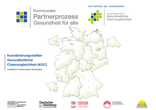Der kommunale Partnerprozess "Gesundheit für alle" wird getragen von den Partnern BZgA, Deutscher Städtetag, Deutscher Städte- und Gemeindebund, Deutscher Landkreistag und dem Gesunde Städte Netzwerk. Zentrale Anlaufstellen in den Bundesländern sind die Koordinierungsstellen Gesundheitliche Chancengleichheit (KCG).