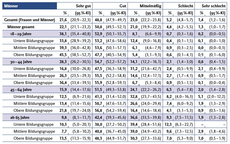 - Ein regionaler Vergleich zeigt, dass Frauen in Bayern und Männer in BadenWürttemberg ihre Gesundheit besser einschätzen als der Bundesdurchschnitt; unter dem Bundesdurchschnitt dagegen liegen die Einschätzungen »sehr guter oder guter« Gesundheit für Frauen in der Region Ost (Süd) und Männer in der Region Mitte.